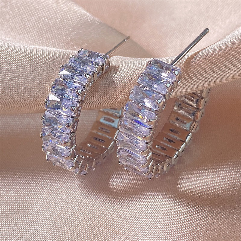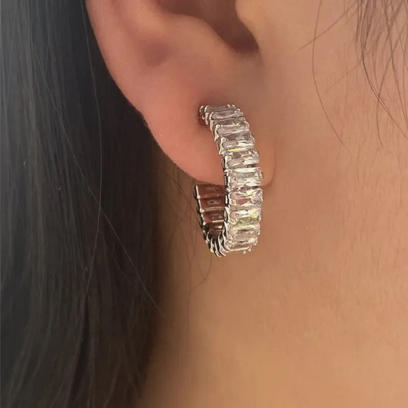 These pretty hoops are decorated with a glistening row of baguettes cut stones.