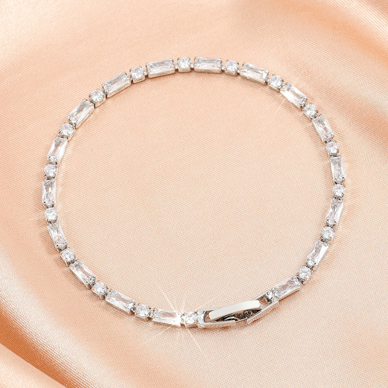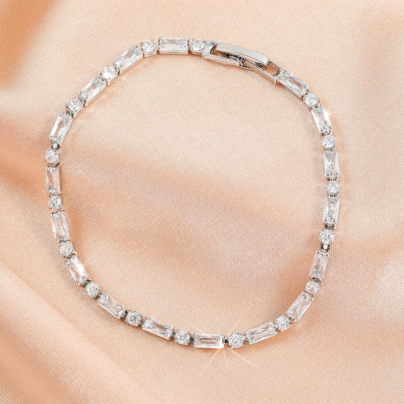 This bracelet showcases a dazzling row of Emerald cut and Round cut cubic zirconia stones, each set to create a captivating and sophisticated look.