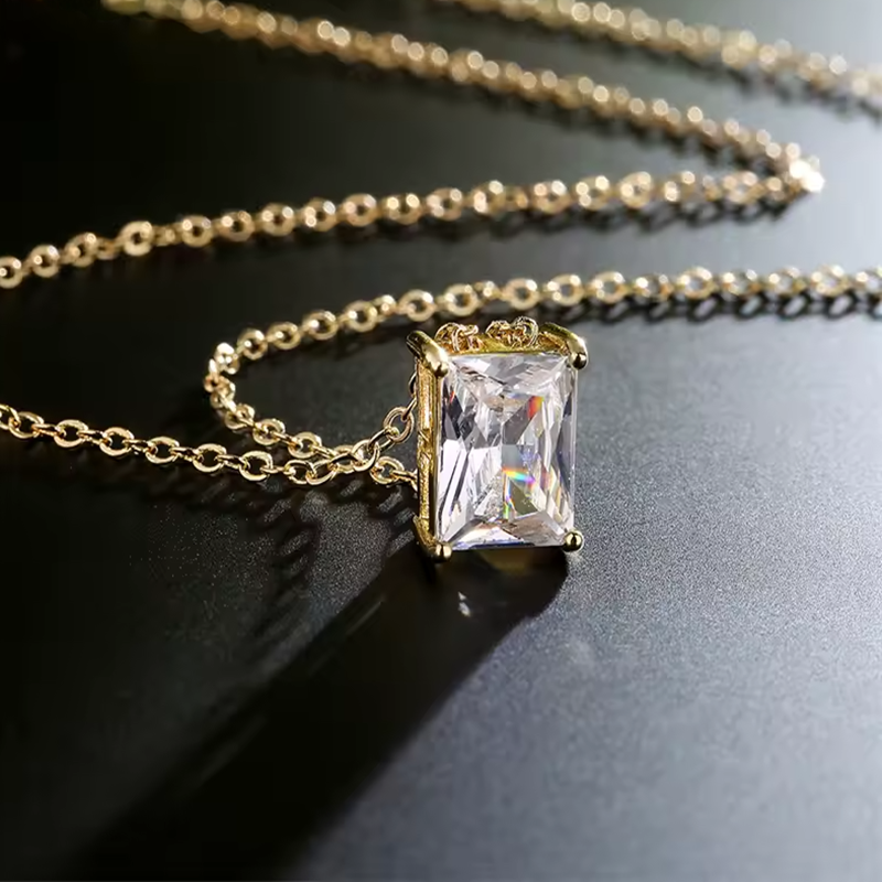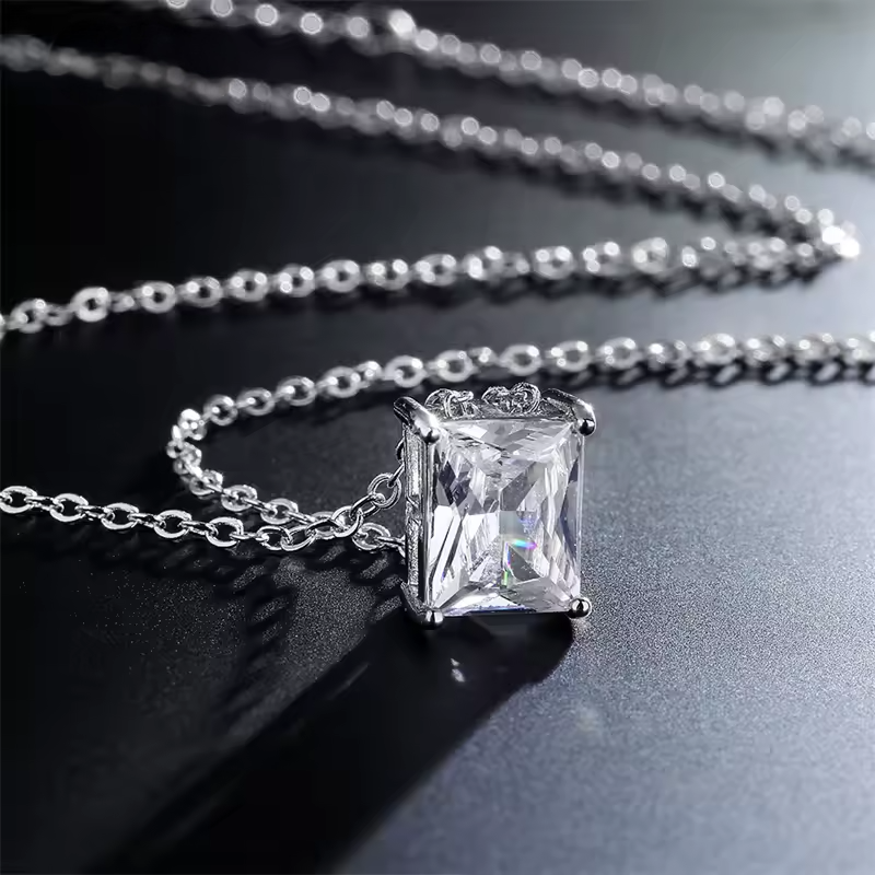 Designed in either White Gold or Gold plating, this stunning pendant features a clear square cut stone for breath-taking sparkle.